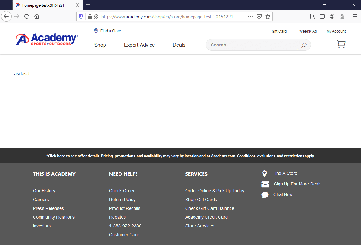 Built on the Adobe Experience Cloud framework, academy.com relies heavily on Adobe ecommerce solutions software. These include Adobe Omniture SiteCatalyst (analytics), Test and Target (targeting, split and multivariate testing), Connect (web conferencing), and Scene7 (image processing and retrieval). Data tracking on academy.com includes Google, Bing, Facebook, Dotomi, Ruxit, Quantum Metric, Pingdom, Visual IQ, and more. Academy Sports + Outdoors has implemented BrightEdge SEO optimization, Evergage conversion optimization, and Bazaarvoice feedback forms. It’s hosted by Akamai on Apache servers and uses the Akamai Edge content delivery network.